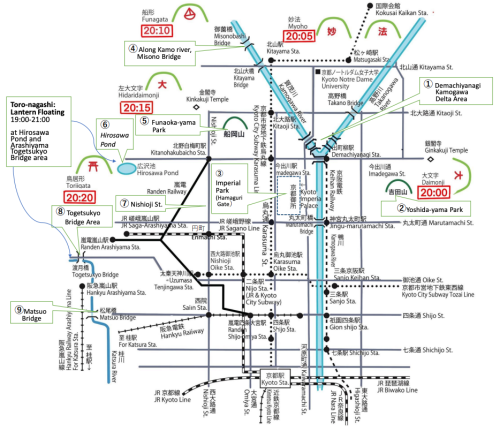 - 送火(送り火): 在山上或自家焚燒的火,用於送別精靈。最有名的例子是京都的五山送火,在五座山上點燃巨大的文字或圖案,場面非常壯觀。